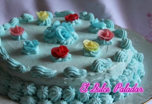 Luego montamos la nata bien fría, agregando el azúcar cuando esté semimontada, no sobrebatir para que no se corte, y una vez esté montada agregar el colorante azul con movimientos envolventes. Es la hora de empezar a funcionar la manga pastelera y dejar a tu imaginación colocar moñitos a tu gusto...